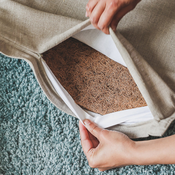 Esta colchoneta de lino rellena de fibra de coco , acompañada de un cojín de casco de trigo sarraceno, proporciona un apoyo firme y estable para las cervicales .